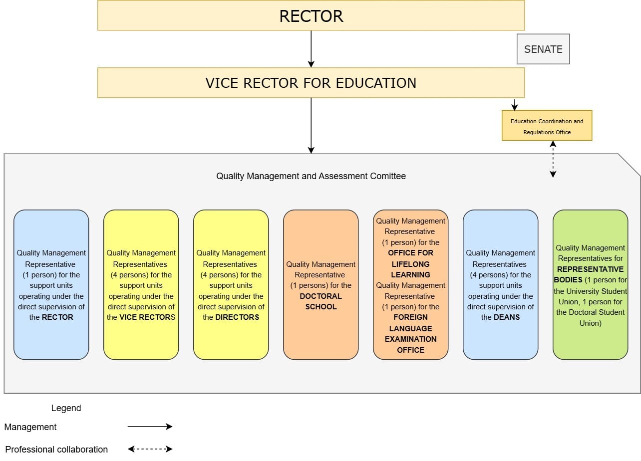 To ensure the fulfilment of the University’s tasks at an appropriate quality level, the Quality Management and Assessment Committee was established to conduct regular monitoring of processes, eliminate sources of error, and develop the operational process system.