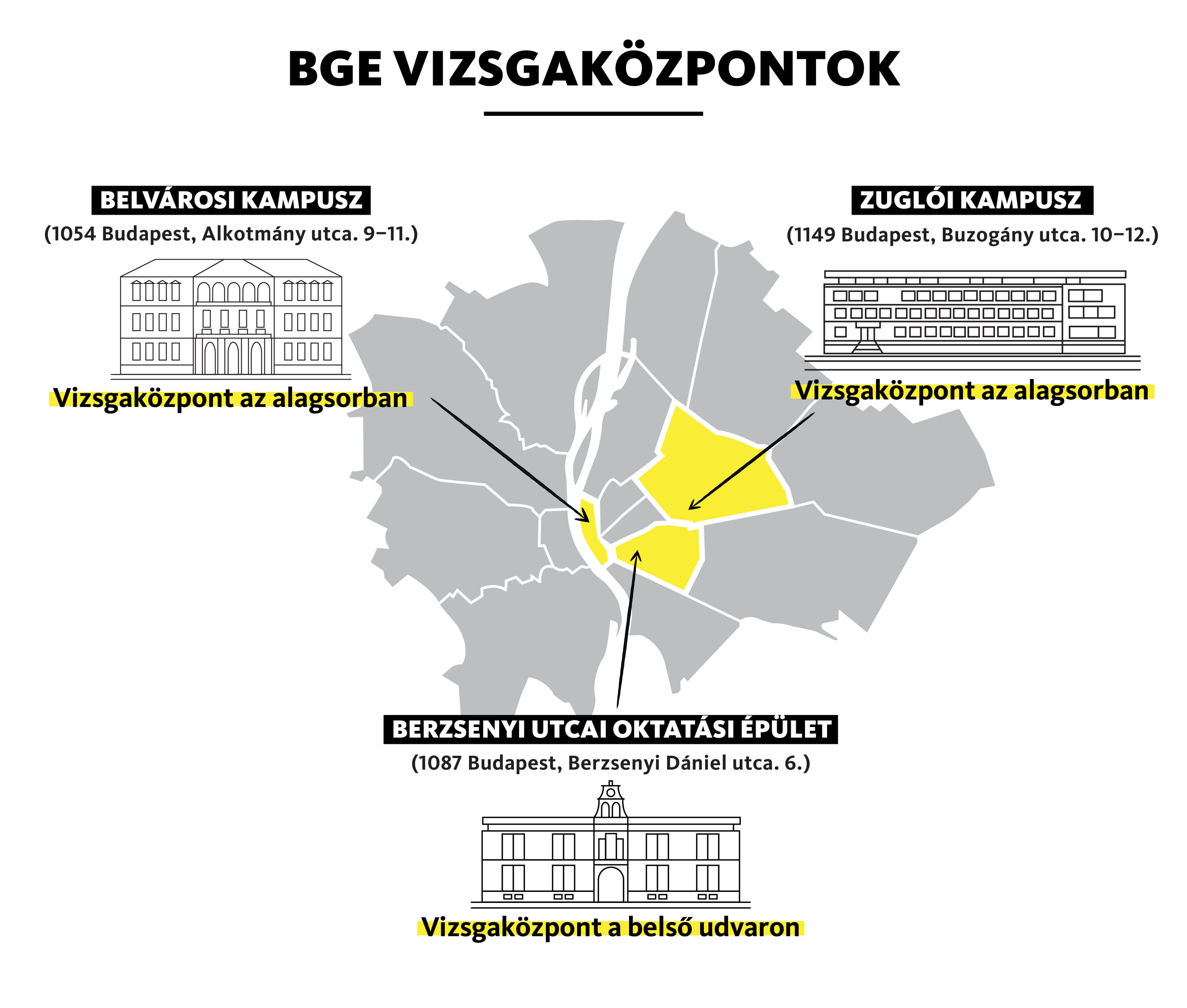 A BGE intézményrendszerén belül három helyszínen fogadja a hallgatókat a vizsgaközpont, az alábbiak szerint: