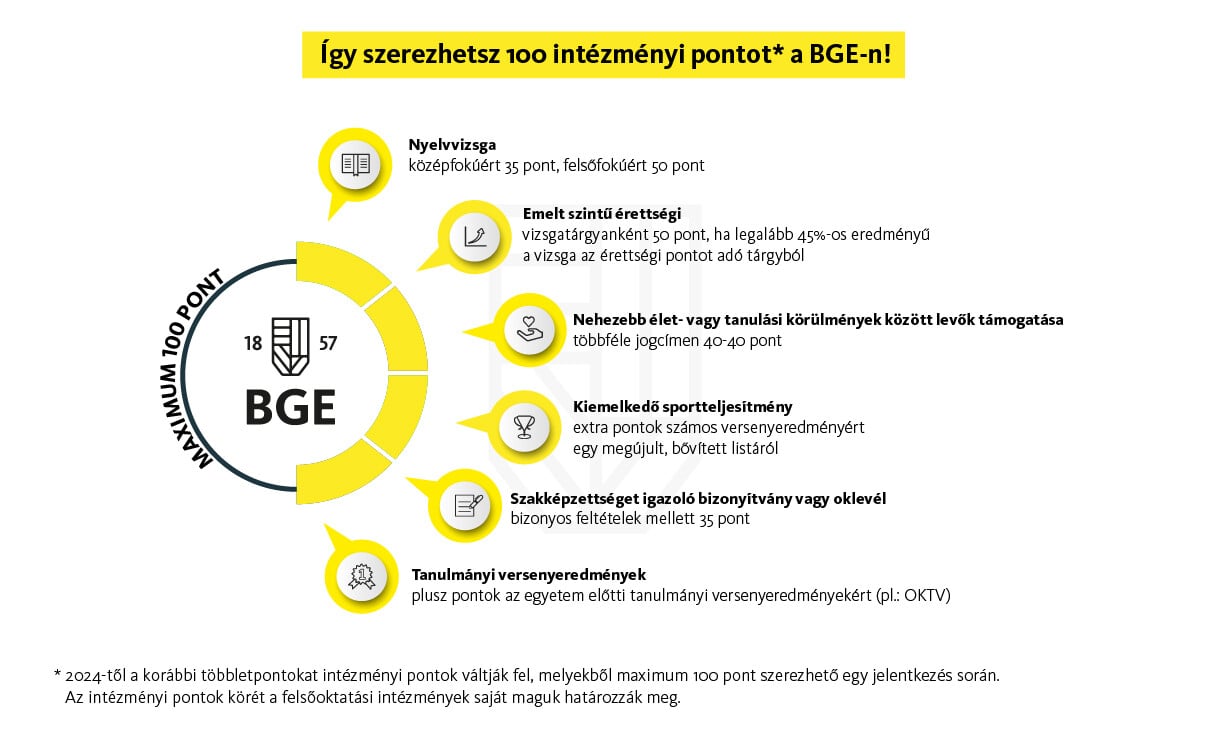 A 2024-től érvényes felvételi rendszerben az intézményi pontok (max. 100 pont) lehetőséget adnak arra, hogy a jelentkezők a tanulmányi és érettségi pontokon túl is növeljék összpontszámukat. A Budapesti Gazdaságtudományi Egyetemen ezek a pontok a felvételizők korábbi teljesítményét és többlettudását ismerik el, így nemcsak a jegyek számítanak, hanem az egyéni erősségek is.