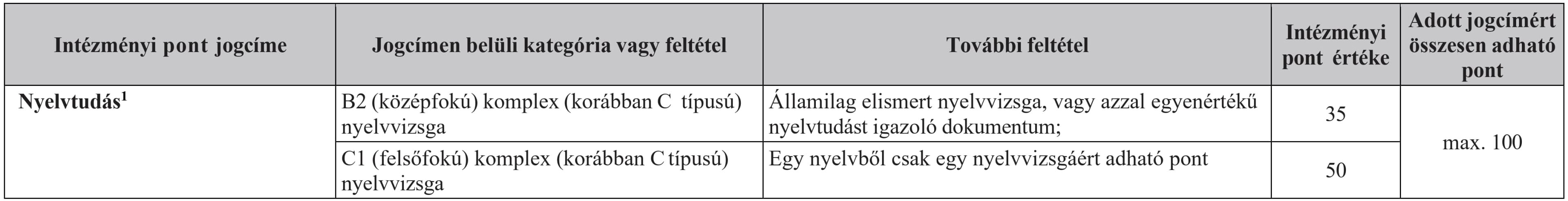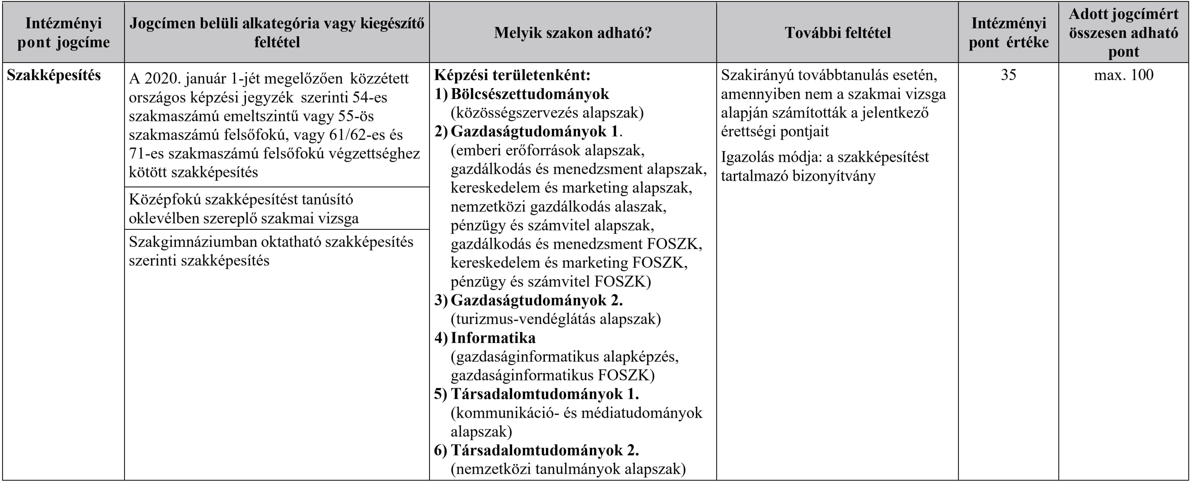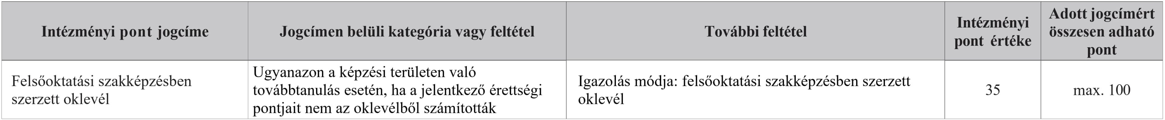 A BGE alapképzési szakjain és felsőoktatási szakképzésén az alábbi intézményi pontrendszer érvényes, a szakoktató alapképzési szak kivételével, amelyen nem adható intézményi pont.
