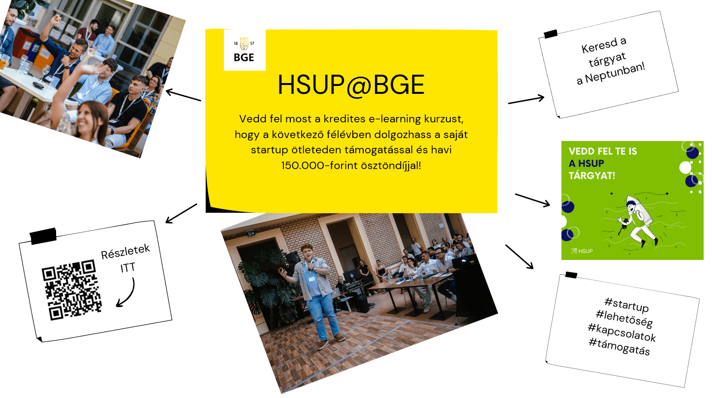 Idén is elindul a BGE-n is a HSUP, Magyarország első országos, felsőoktatási szintű e-learning startup kurzusa. Az első félévben 100%-ban online teljesíthető képzés elvégzésével lehetőséget nyersz arra, hogy a következő félévben akár mentori támogatással, havi 150.000 forintos ösztöndíjért dolgozz a saját startup ötleteden a csapattársaiddal.