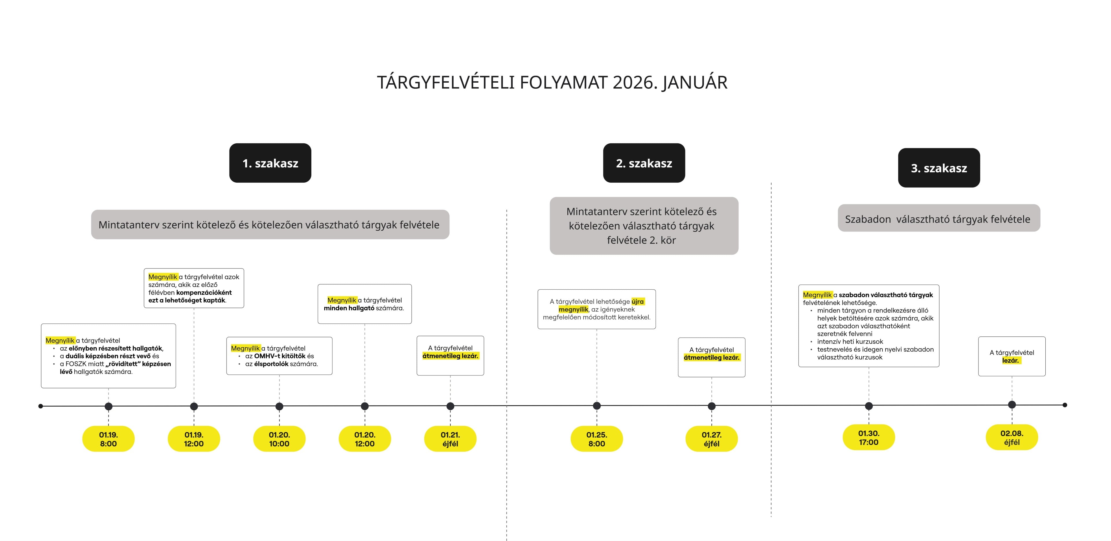 Frissítve: 2026. 01. 19. 17:15Az alábbi ábrán látható a 2025/2026-os tanév II. félévének tárgyfelvételi folyamata. A nagyobb ábra megtekintéséhez a képre kattintva, vagy a kép alatt jelzett dokumentum megnyitásával van lehetőség.
