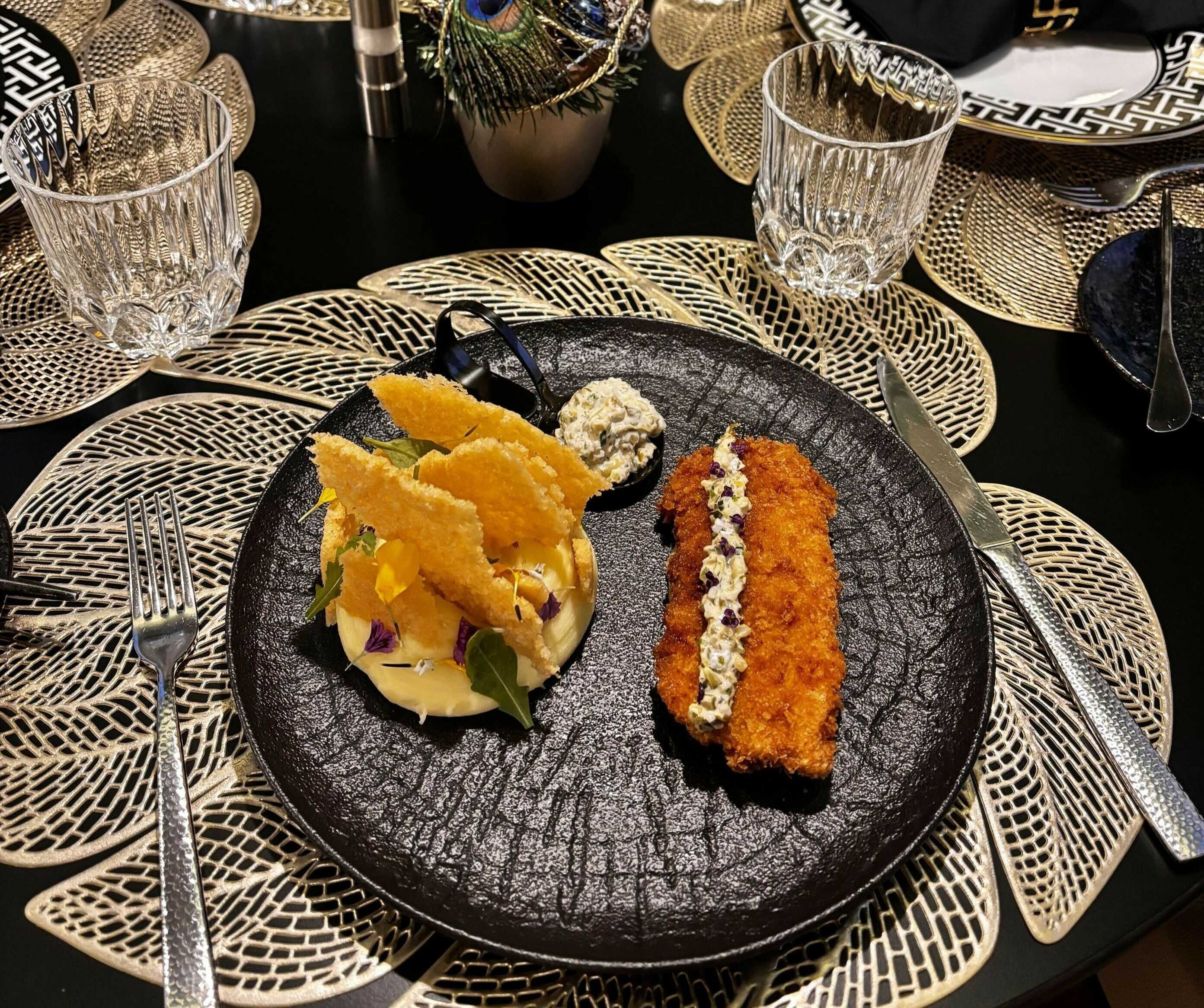 Rántott tőkehal filé parmezános burgonyapürével és remulád mártással