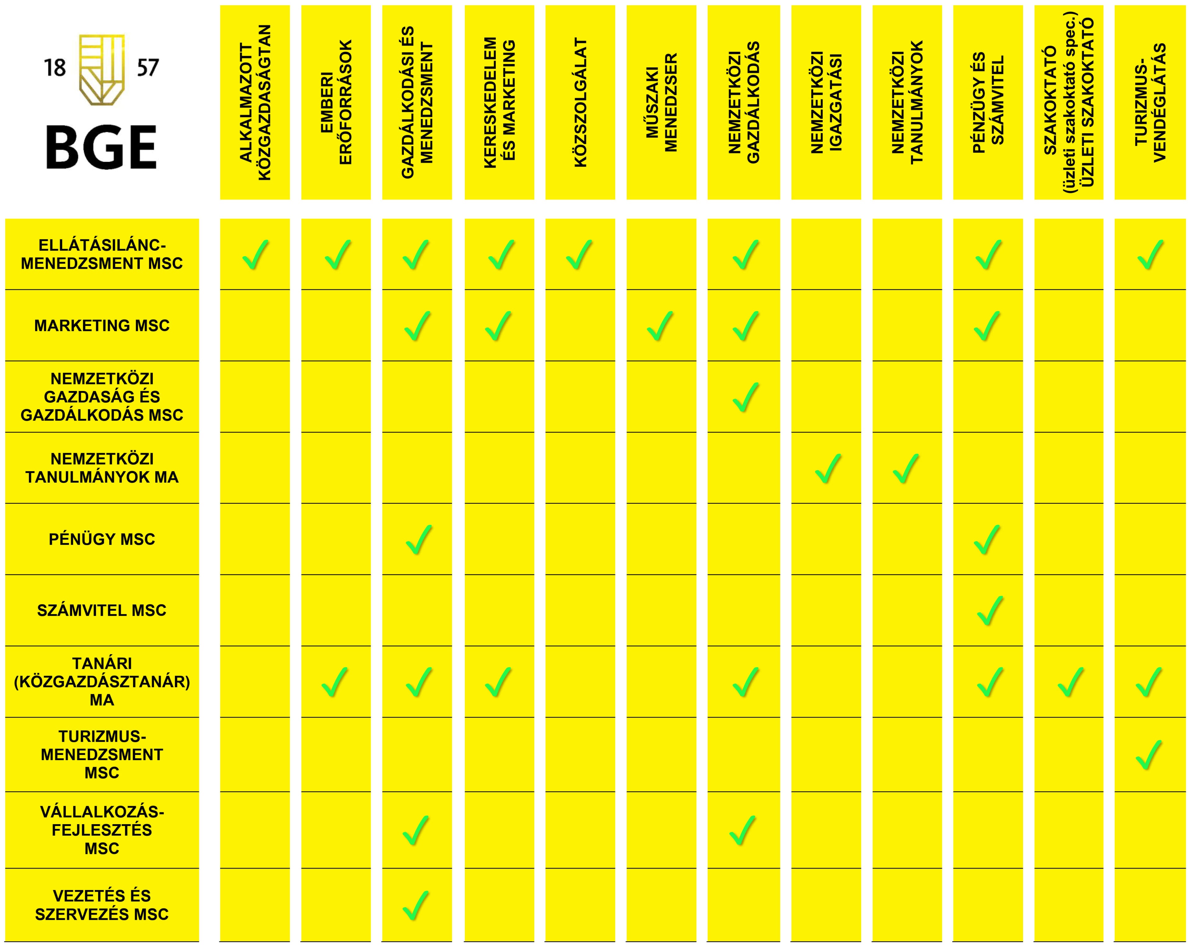 A) Az alábbi táblázatban összefoglalóan látható, hogy az egyes mesterszakok esetében mely alapképzési szakok oklevele fogadható el a teljes kreditérték beszámításával. Ilyen esetekben az oklevél és a Felvételi Tájékoztatóban meghatározott egyéb dokumentumok benyújtásával lehet jelentkezni mesterképzésre, a kreditelismerési eljárás elsődlegesen a bemeneti oklevél ellenőrzését jelenti.