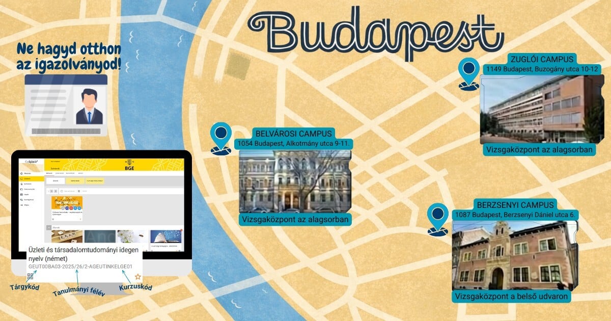 A BGE intézményrendszerén belül három helyszínen fogadja a hallgatókat a vizsgaközpont, az alábbiak szerint: