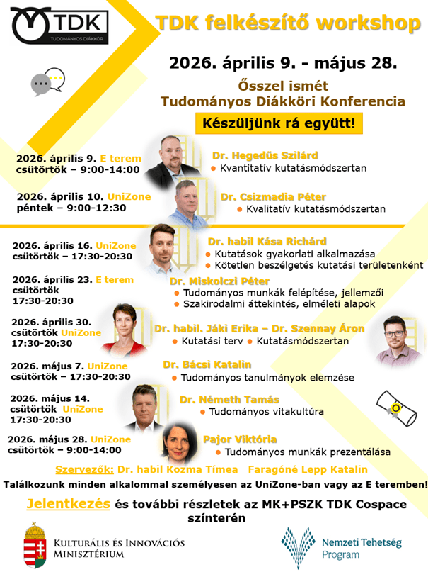 2026. április 9. és május 28. között TDK felkészítő workshopot szervezünk azoknak a hallgatóknak, akik az őszi Tudományos Diákköri Konferenciára szeretnének felkészülni, vagy érdeklődnek a tudományos kutatás alapjai iránt.
